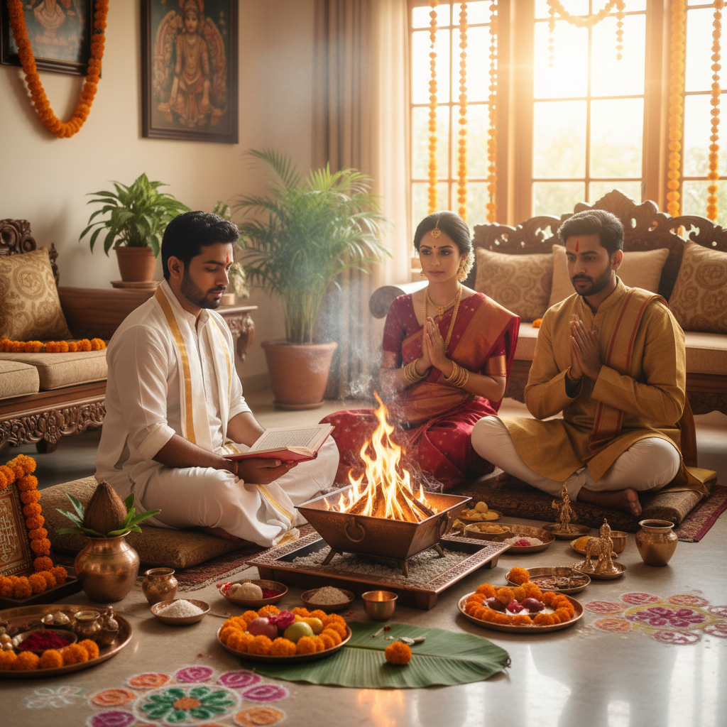 Vastu Shanti Puja is a sacred Vedic ritual performed to remove Vastu doshas and create positive energy, peace, and prosperity in the home or workplace.